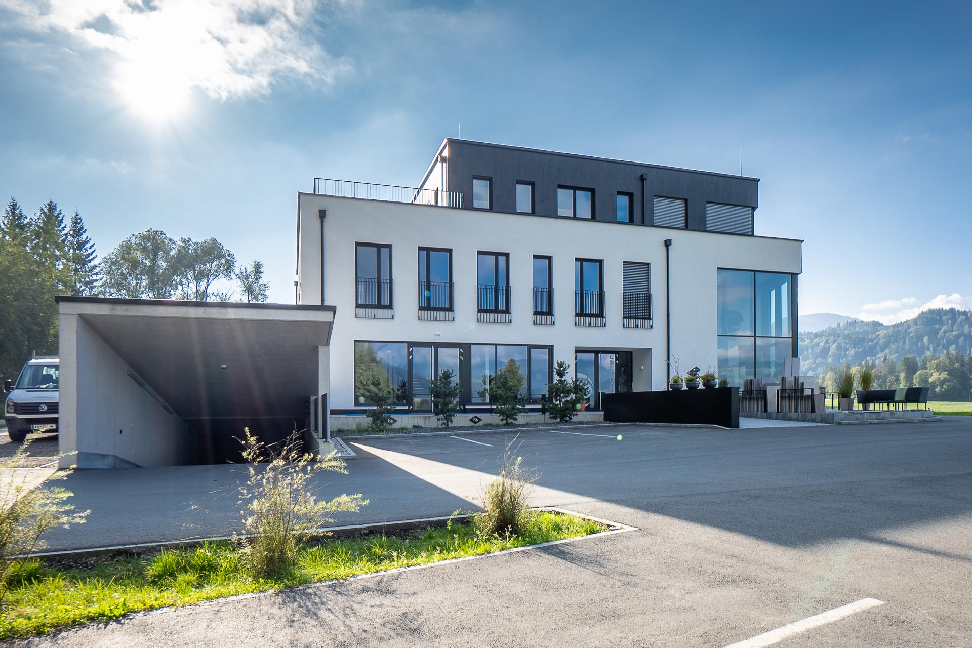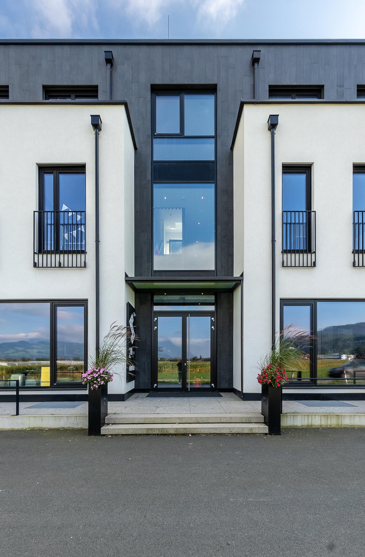 Designte Qualität Der Entwurf der Kaiser Nordwand entstammt der Feder der Planungsfirma Plan360°. Durch das breitaufgestellte Team des Planungsunternehmens von Architekten und Innenarchitekten bis hin zu Baumeistern entstand ein ganzheitliches Konzept, welches den gehobenen Standard der neuen Unternehmerheimat auch optisch zum Ausdruck bringt. Schwarz umrahmte Fenster geben dem Gebäude ein charakteristisches Gesicht. Oberflächen aus Feinkeramik verbinden Qualität mit Ausdrucksstärke. „Das Material ist unverwüstlich und unveränderbar, und spiegelt den gehobenen Stellenwert wider“, so Franz Hechenbichler. „Klaus Suppacher und ich kommen beide aus dem Architekturbereich bzw. der Einrichtungsszene und legen daher größten Wert auf einen optisch ansprechenden Entwurf, welcher von Qualität zeugt aber auch durch seine Funktionalität besticht.“